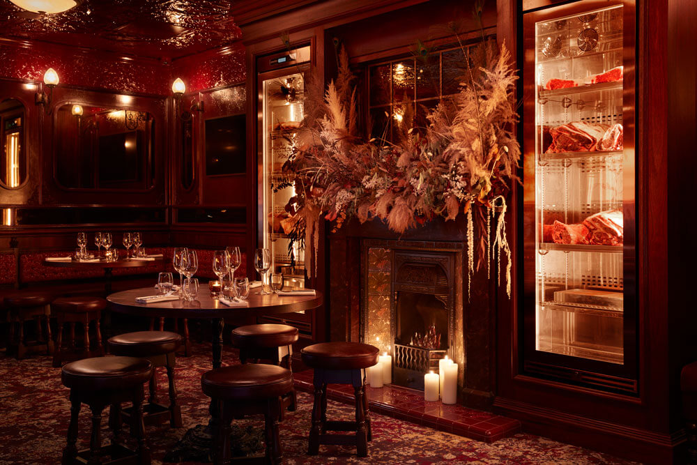 Named after The Rose and Crown, which opened here in the 1600s, The Rose Room is our private lower-ground events space. It accommodates up to 45 standing or 35 seated guests and features a private horseshoe bar with a custom stained-glass wall, two large meat-aging fridges for premium British beef, and four hidden-art TV screens for presentations or live sports. State-of-the-art AV system and DJ available on request.